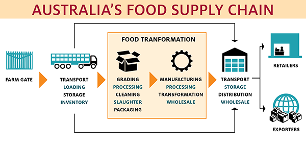 As the supply chain diagram shows, food in Australia rarely moves in a straight line from farm to consumer. It passes through multiple stages — production, aggregation, processing, distribution, and retail — often separated by hundreds or thousands of kilometres.